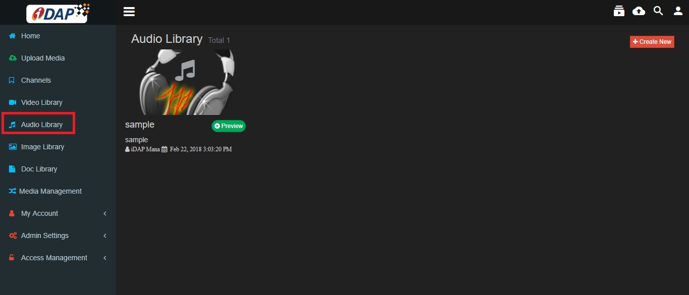 Click on ‘Audio Library’ to view all the uploaded audio file with their relevant channel name. Also the user can upload the new audio files through ‘Create New’ button .