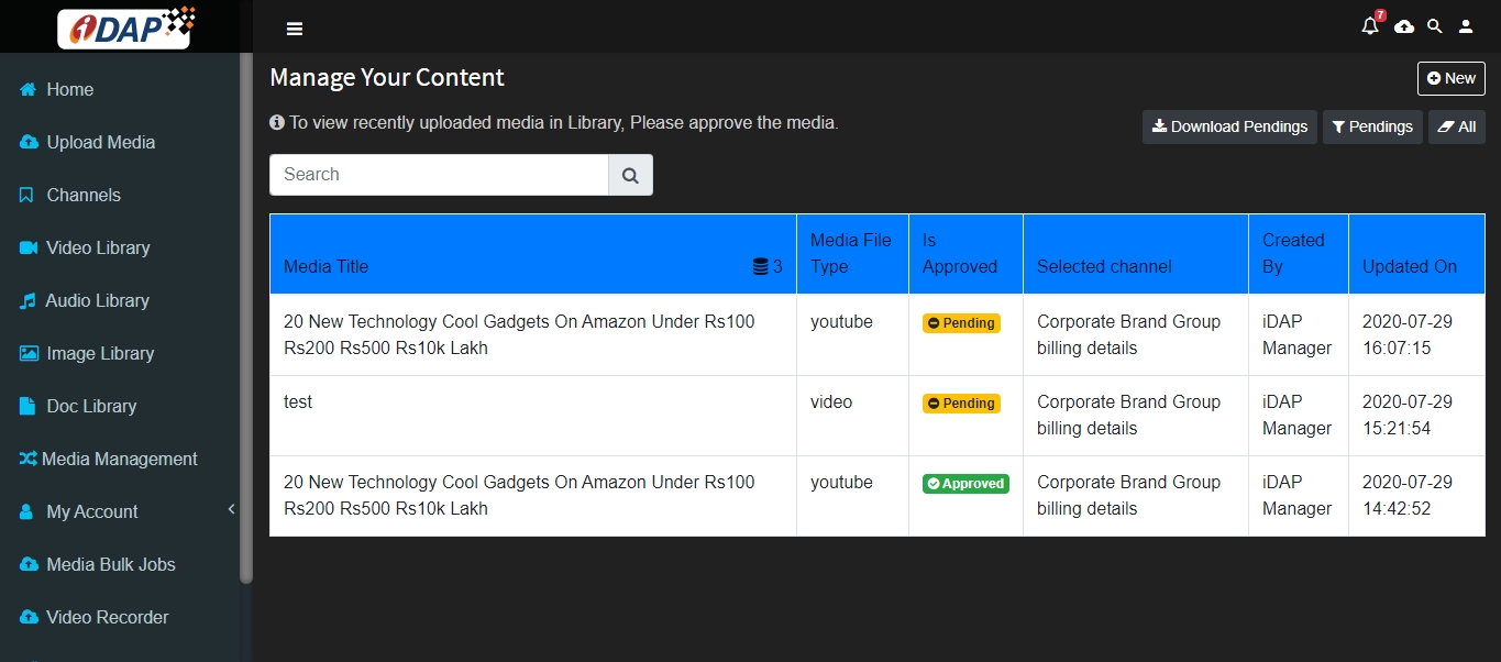 After the YouTube Video is uploaded it appears in My Media section in ‘Pending’ State.